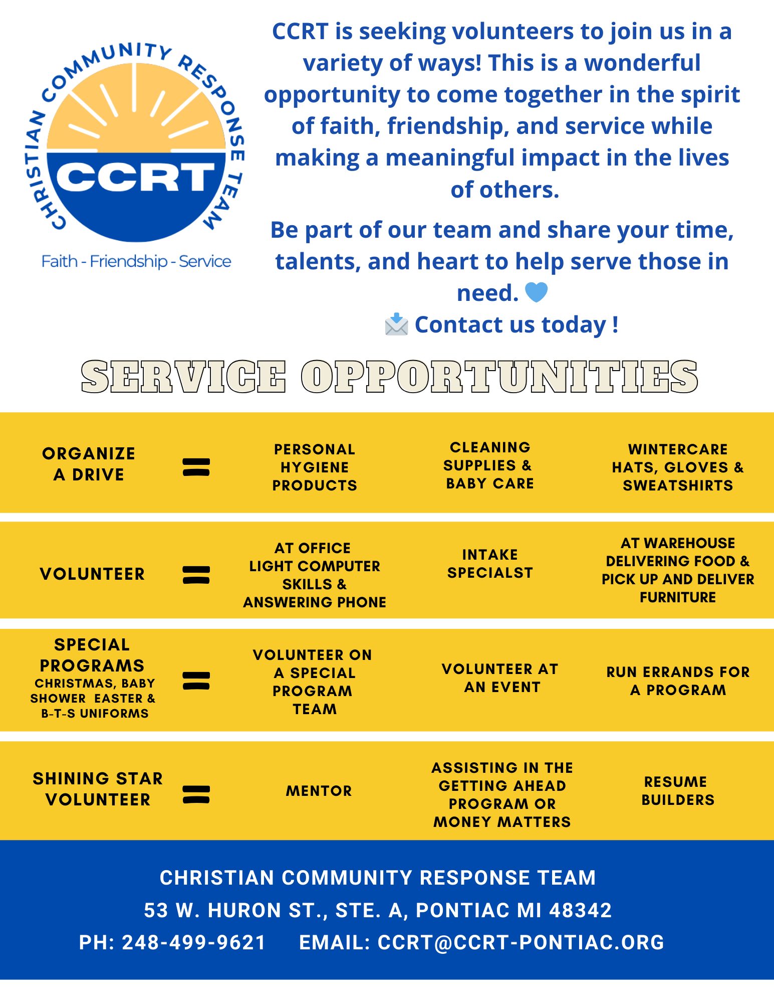 Volunteering at CCRT is a meaningful way to serve neighbors in need, build community, and make a lasting impact in Pontiac and surrounding areas.